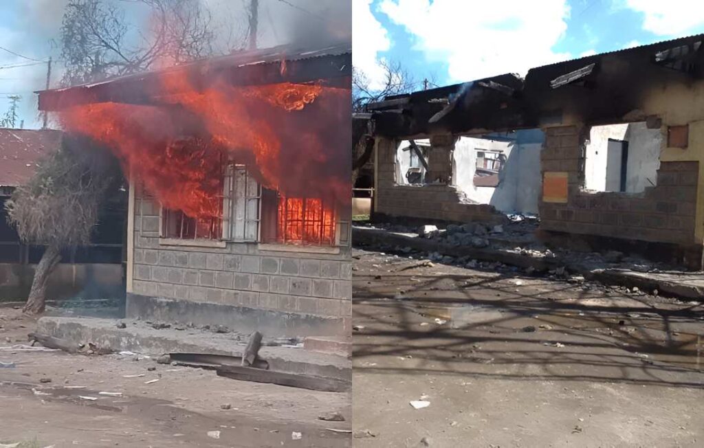 Residents burn building, chant ‘Ruto Must Go’ during a public forum. Photo: Courtesy.