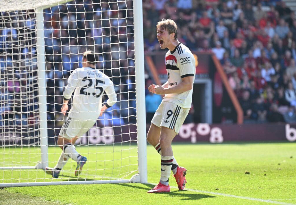 Rasmus Hojlund’s injury-time goal secured a point for Manchester United, dealing a setback to Bournemouth’s hopes of European qualification after they were reduced to 10 men.