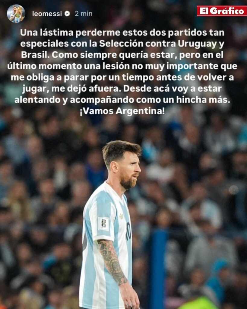 “It’s a shame to miss these two very special matches with the National Team against Uruguay and Brazil. As always, I wanted to be there, but at the last moment, a not-so-serious injury that forces me to stop for a while before returning to play left me out,” Messi explained on his Instagram account.