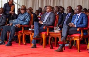 The head of State, William Ruto, Former Deputy President Rigathi Gachagua and Former President of Kenya, Uhuru Kenyatta meet at an event.